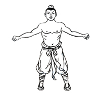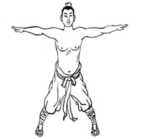左右打开,至水平位握拳。依次放松肩、肘、腕、手指的同时慢慢起身。重复导引七次后,恢复松静站立。
