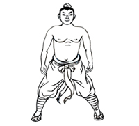 右脚向右跨一大步,屈膝下蹲成大马步。