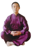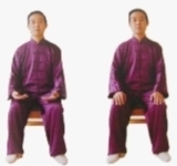 臀部平坐于宽凳或木板床上,两脚掌平踏地,约与肩同宽,大腿与小腿约成直角;两手掌平放于大腿上,掌心朝上、朝下均可;眼可微闭,也可不闭。静坐时姿势要求头自然端正,颈部放松,不可僵硬。躯干正直稳固,不可前俯后仰,东倒西歪。下颏微向内收,唇齿微合,舌尖轻抵上腭,眼微闭,面容轻松自然。肩、臂、肘、腕皆要放松,胸微合,背舒展放松,腹部宽松镇定,会阴穴微微上提。(图2、图3)