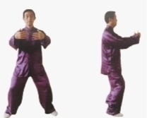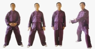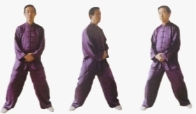 两脚开立,比肩略宽,屈膝松胯,含胸塌腰,立身中正,全身放松。头正,微上顶,颈部放松,唇齿微合,舌尖轻抵上腭;两臂弧形环抱于胸前,手心朝里,指尖相对,肩松肘沉;裆要开圆,脚踏实地,脚趾、脚外侧、脚跟皆贴地,涌泉穴要虚,重心在两腿之间。(图17、图17附图)