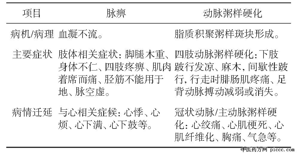 各种动脉硬化的共同特点是动脉管壁增厚变硬, 失去弹性和管腔缩小。病变部位从动脉内膜开始, 导致脂质和复合糖类积聚、出血和血栓形成、纤维组织增生和钙质沉着, 并有动脉中层的逐渐退变和钙化[8]。中医脉痹与现代医学动脉粥样硬化极为相似 (见表2) , 前者主要由于各种原因导致血凝不流, 后者主要由于脂质聚积等导致动脉管壁增厚、管腔缩小, 故临床上动脉粥样硬化可参考中医脉痹进行辨治。