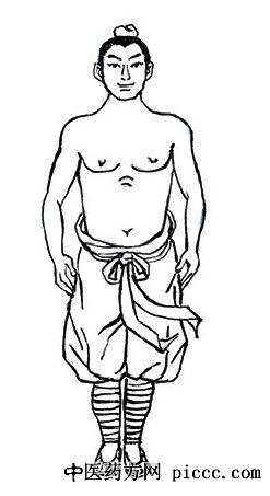 图12、13动作要领:放直两足,膝盖挺直,脚尖内扣。以两手向前攀脚心21次。收回双足,端坐放松。