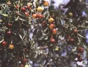 【原形态】 枣 落叶灌木或小乔木,高达10m。有长枝、短枝和新枝,长枝平滑,无毛,幼枝纤细略呈“之”形弯曲,紫红色或灰褐色,具2个托叶刺,长刺可达3cm,粗直,短刺下弯,长4-6mm;短枝短粗,长圆状,自老枝发出;当年生小枝绿色,下垂,单生或2-7个簇生于短枝上。单叶互生,纸质,叶柄长1-6mm,长枝上的可达1cm;叶片卵形、卵状椭圆形,长3-7cm,宽2-4cm,先端钝圆或圆形,具小尖头,基部稍偏斜,近圆形,边缘具细锯齿,上面深绿色,无毛,下面浅绿色,无毛或沿脉被疏柔毛;基生三出脉。花黄绿色,两性,常2-8朵着生于叶腋成聚伞花序;萼5裂,裂片卵状三角形;花瓣5,倒卵圆形,基部有爪;雄蕊5,与花瓣对生,着生于花盘边缘;花盘厚,肉质,圆形,5裂;子房2室.与花盘合生,花柱2半裂。核果长圆形或长卵圆形,长2-3.5cm,直径1.5-2cm,成熟时红色,后变红紫色,中果皮肉质、厚、味甜,核两端锐尖。种子扁椭圆形,长约1cm。花期5-7月,果期8-9月。