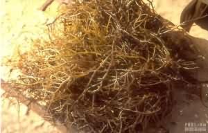 藻体直立,丛生,高10~50厘米,可达1米,紫褐色,有时略带绿色或黄色,干后变褐,软骨质,线形,圆柱状,基部具有一盘状固着器,一般具一主干,径1~2毫米,分枝1~2次,向各个方向互生或偏生,枝径O.5~1毫米。藻体的内部为大的薄壁细胞组成的髓部,外围以2~5层逐渐变小的皮层细胞。四分孢子囊紫红色,散生在藻体的表面,埋于皮层细胞中,十字形分裂,精子囊生于浅坑或生殖窠状的下陷部分内,色淡黄。囊果球形或半球形。