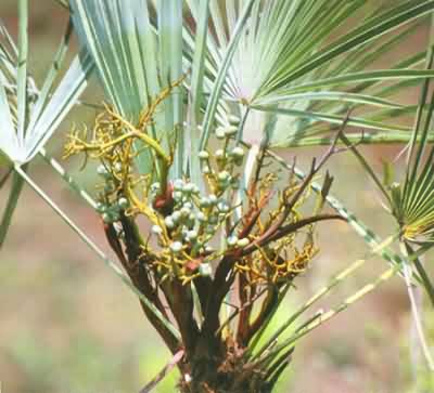 【原形态】 龙棕,矮小灌木,高0.5-0.8m。无地上茎,地下茎节密集,直径约6cm,多须根,向上弯曲,犹如龙状,故名龙棕。叶簇生于地面,叶柄长25-35cm,两侧有或无密齿;叶片形状如棕榈叶,但较小和更深裂,裂片为线状披针形,长25-55cm,宽1.5-2.5cm,先端浅2裂,上面绿色,下面苍白色。花序从地面直立伸出,较小,长40-48cm,通常二回分歧;花雌雄异株;雄花球形,黄绿色,萼片3,花瓣2倍长于萼片,发育雄蕊6,退化雄蕊3;雌花淡绿色,球状卵形,花瓣稍长于萼片,心皮3,被银色毛,胚珠3颗,但只1颗发育。核果肾形,蓝黑色,宽10-12mm,高6-8mm。花期4月,果期10月。