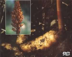 【原形态】 天麻,多年生寄生草本,高60-100cm,全株不含叶绿素。块茎肥厚,肉质,长圆形,长约10cm,直径3-4.5cm,有不甚明显的环节。茎圆柱形,黄赤色。叶呈鳞片状,膜质,长1-2cm,具细脉,下部短鞘状抱茎。总状花序顶生,长10-30cm,花黄赤色;花梗短,长2-3mm;苞片膜质,狭披针形或线状长椭圆形,长约1cm;花被管歪壶状,口部斜形,基部下侧稍膨大,先端5裂,裂片小,三角形;唇瓣高于花被管的2/3,具3裂片,中央裂片较大,其基部在花管内呈短柄状;合蕊柱长5-6mm,先端具2个小的附属物;子房倒卵形,子房柄扭转。蒴果长圆形至长圆状倒卵形,长约15mm,具短梗。种子多而细小,呈粉末状,花期6-7月。果期7-8月。